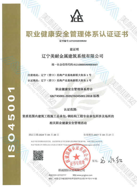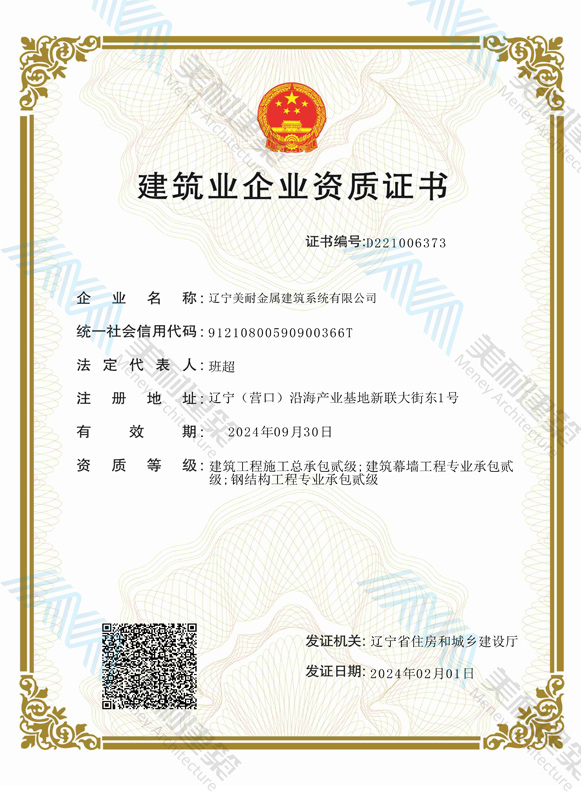 遼寧美耐金屬建筑系統(tǒng)有限公司位于遼寧(營口)沿海產(chǎn)業(yè)基地,專注于預(yù)制金屬建筑系統(tǒng)領(lǐng)域,是一家集工業(yè)建筑設(shè)計、制作、施工及相關(guān)的技術(shù)咨詢與服務(wù)為一體的綜合性服務(wù)企業(yè)。作為國家鋼結(jié)構(gòu)協(xié)會會員、中國建筑金屬結(jié)構(gòu)協(xié)會會員單位與國家高新技術(shù)企業(yè),美耐建筑集建筑工程施工總承包、鋼結(jié)構(gòu)工程專業(yè)承包等多種資質(zhì)于一身,并擁有22項鋼結(jié)構(gòu)建筑領(lǐng)域?qū)@?項軟件著作權(quán)。